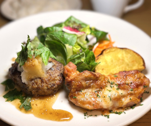 ・自家製ハンバーグおろしポン酢&チキンのトマトチーズ焼き