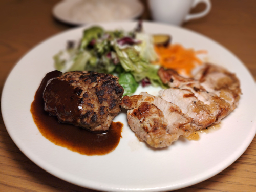 ・自家製ハンバーグデミグラスソース&ポークグリルオニオンペッパーソース
