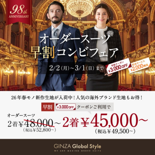 3/1までの期間限定!オーダースーツ2着で合計5,000円相当プレゼント